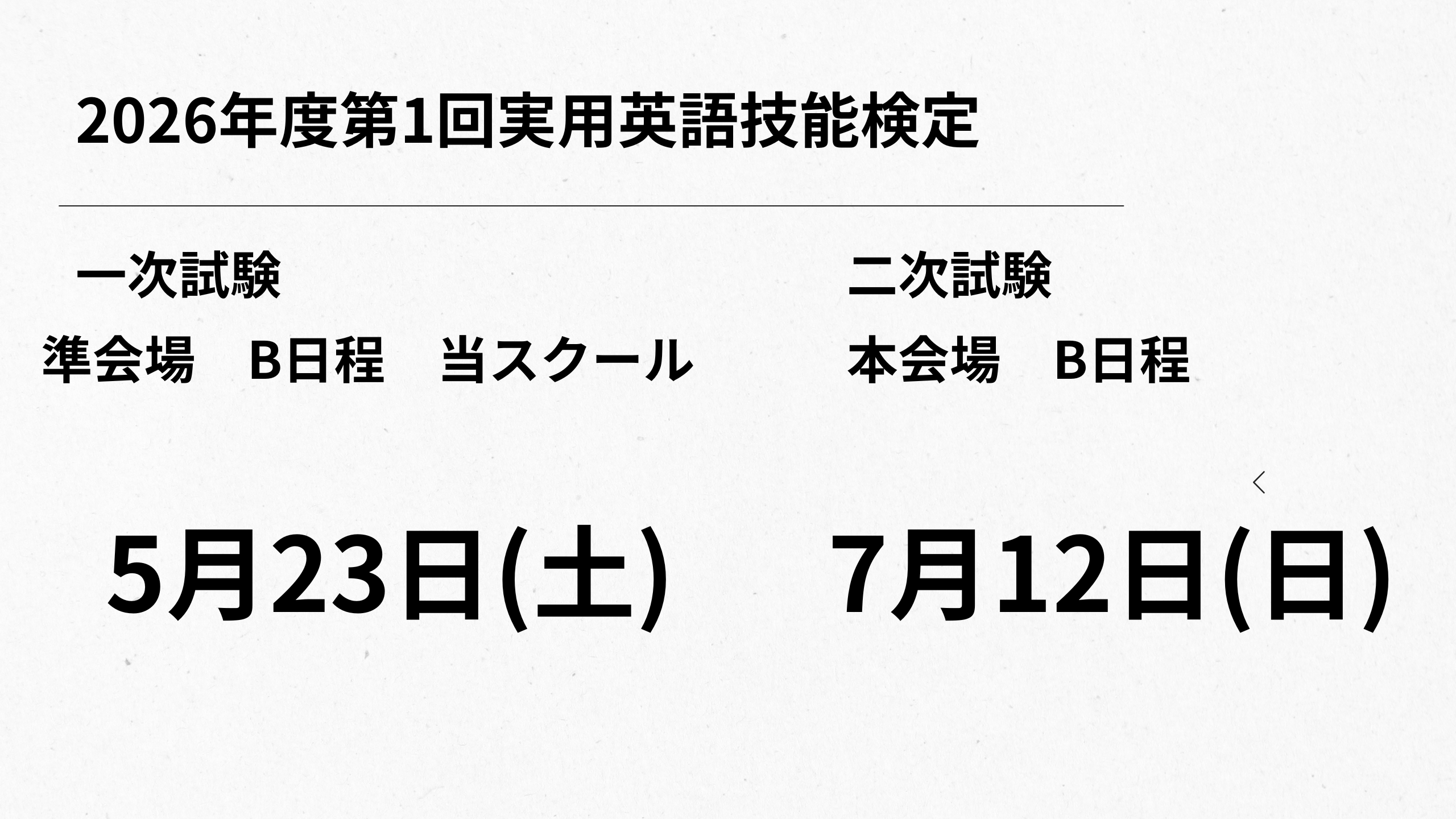 2026年5月23日(土) 当スクールで実施します アプリケーションフォームをご用意しておりますのでお問い合わせください。 スクール外の生徒様も受験可能です |